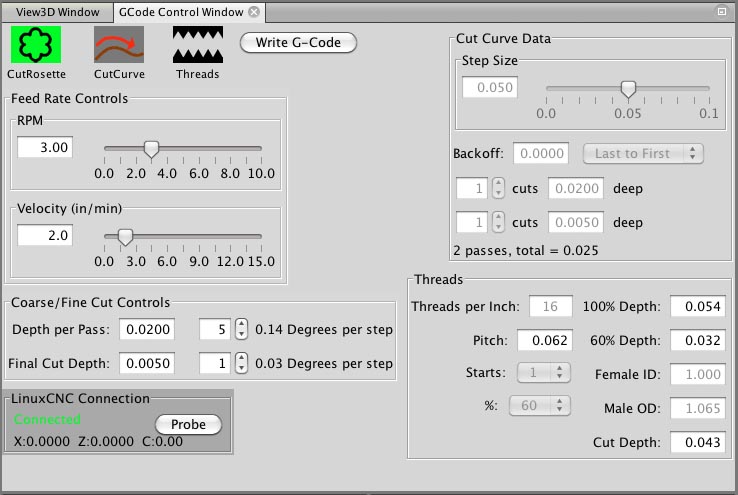 The most important button on the screen is the "Write G-Code" button which creates a file
