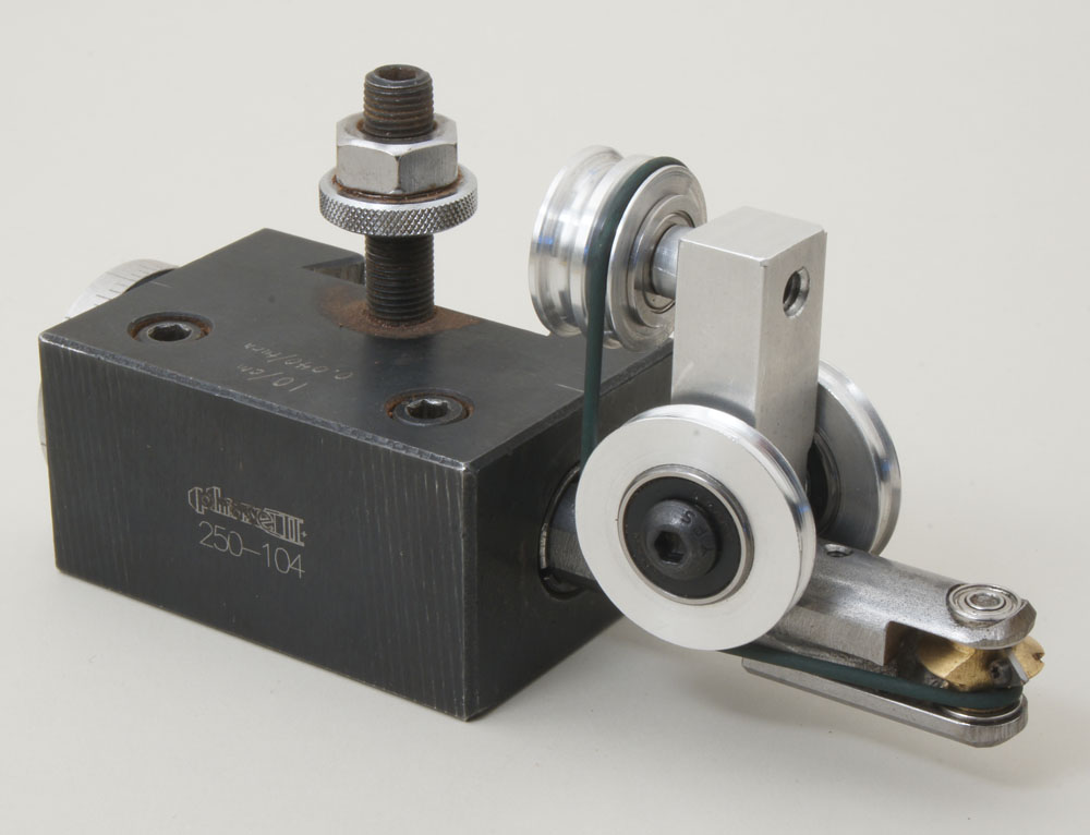 The cutter is powered via a belt from an overhead motor to reduce vibration on the cutter.